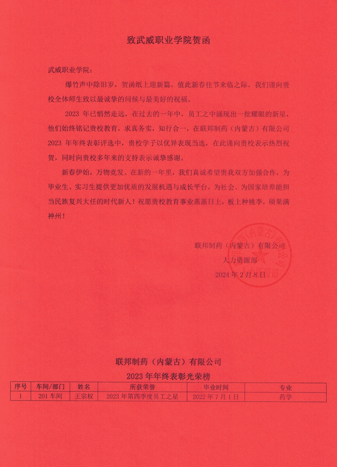 2月初,聯邦制藥(內蒙古)有限公司向學校發(fā)來賀信,在信中感謝學校輸送眾多優(yōu)秀畢業(yè)生,表彰畢業(yè)生在工作中取得的優(yōu)異成績。其中,2022屆畢業(yè)生王宗權榮獲企業(yè)2023年第四季度員工之星。此外,聯邦制藥(內蒙古)有限公司表示愿與學校繼續(xù)加強校企合作,共同為畢業(yè)生提供更加優(yōu)質的發(fā)展機遇與成長平臺,為社會、為國家培養(yǎng)能擔當民族復興大任的時代新人!