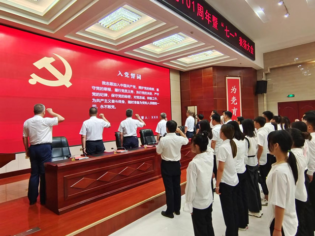 大會在嘹亮的國歌聲中拉開帷幕。面對鮮紅的黨旗,新黨員進行入黨宣誓、老黨員重溫入黨誓詞。