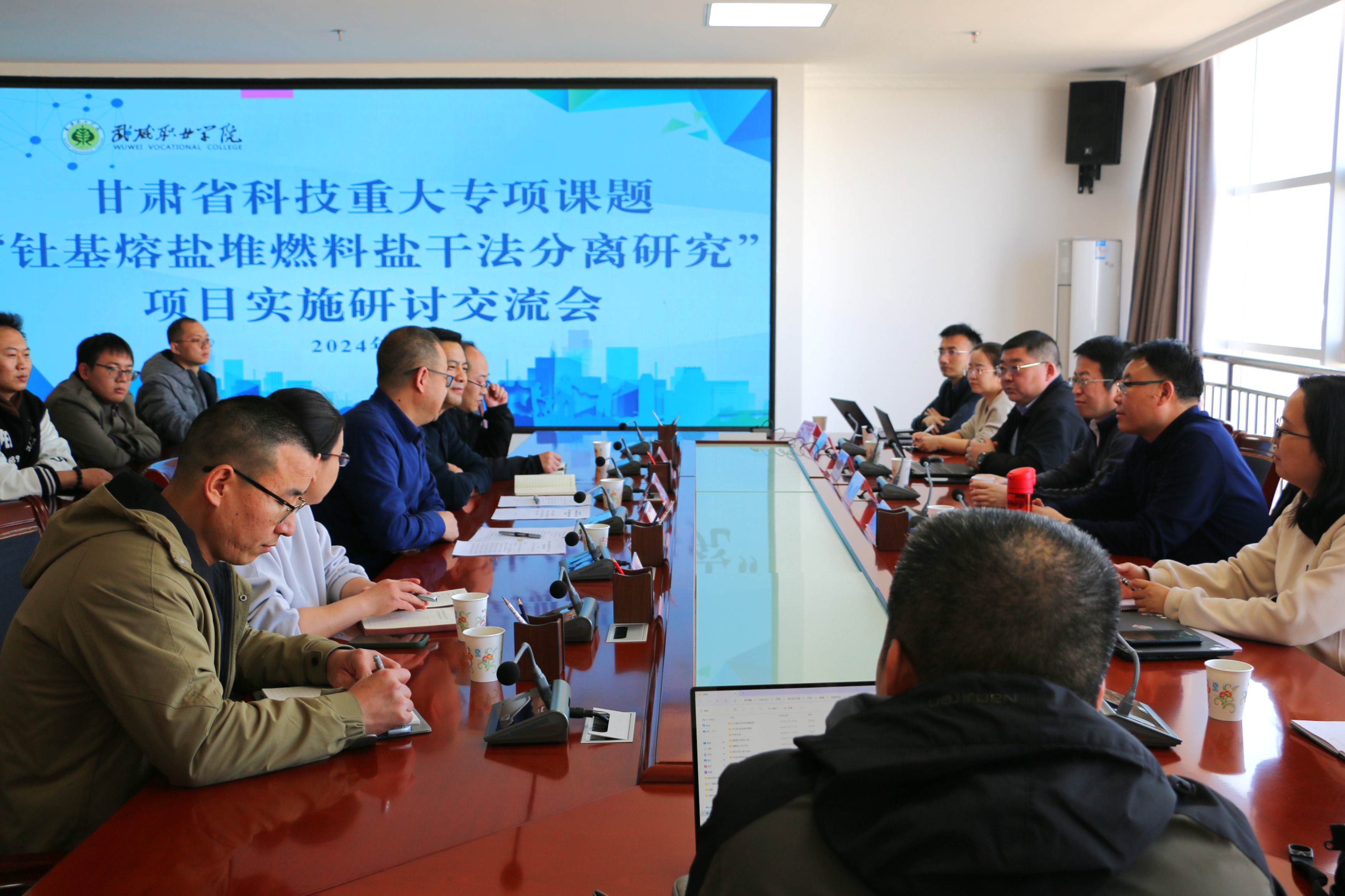 2024年3月11日,甘肅省科技重大專項課題“釷基熔鹽堆燃料鹽干法分離研究”項目實施研討交流會在武威職業(yè)學院能源科技樓811舉行。中科武威新能源研究所主任趙先堂,中國科學院上海應(yīng)用物理研究所主任龔昱一行15人,武威職業(yè)學院黨委副書記翟存祥出席此次會議。項目骨干、武威職業(yè)學院教師代表約50人參加此次會議。會議由中科低碳新能源技術(shù)學院副院長黃述杰主持。