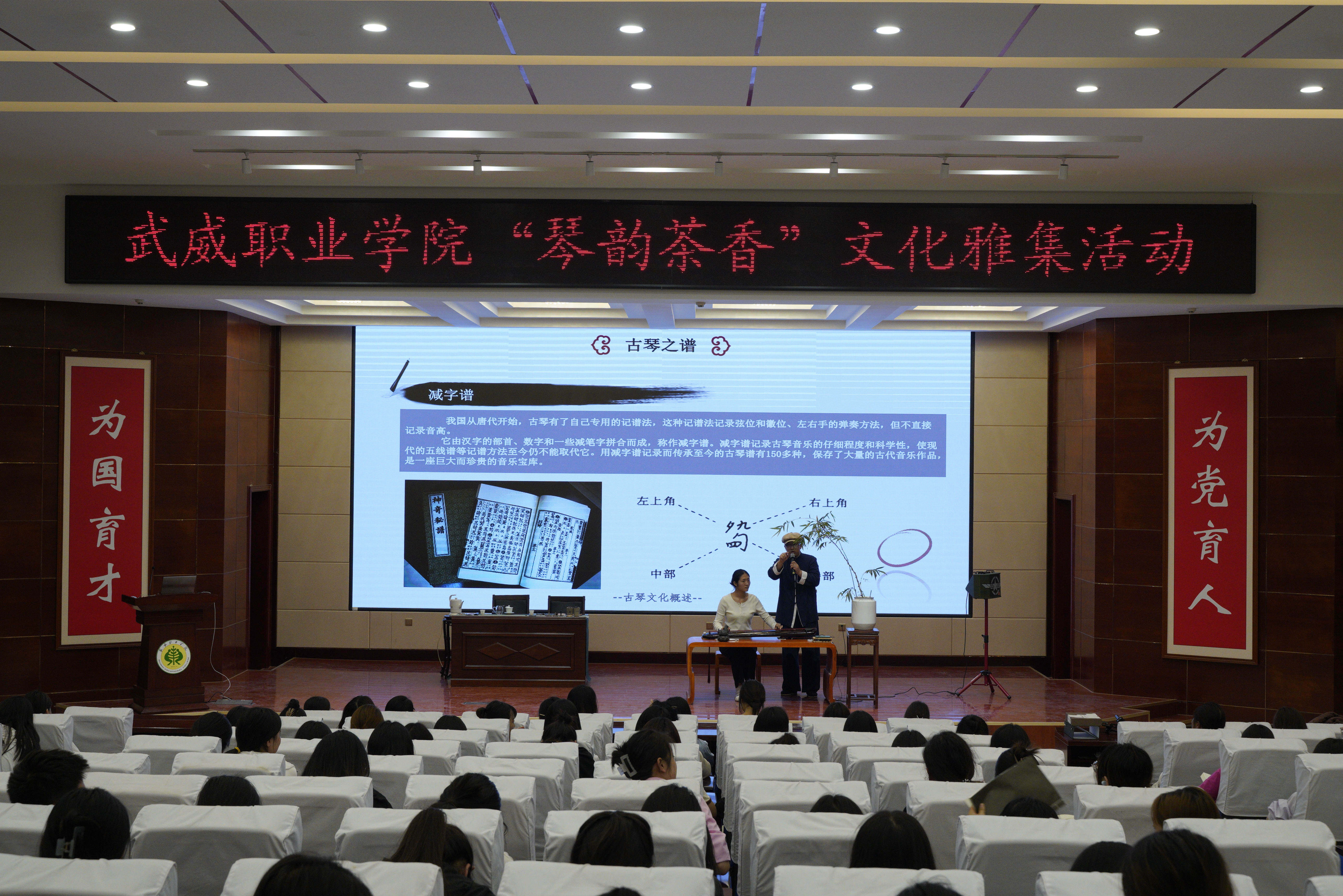 自古以來(lái),文人雅士都曉韻律,善七弦,諳茶道。古琴和茶藝承載著豐富的歷史和文化內(nèi)涵,是中國(guó)傳統(tǒng)文化的重要代表之一。為了使學(xué)生可以更好地了解和傳承中華傳統(tǒng)文化的精髓和特點(diǎn),推動(dòng)傳統(tǒng)文化發(fā)展創(chuàng)新,近日,傳統(tǒng)文化體驗(yàn)中心邀請(qǐng)到武威古琴協(xié)會(huì)會(huì)長(zhǎng)霍宏昌及其團(tuán)隊(duì),在學(xué)校菁英廳開(kāi)展“琴韻茶香”文化雅集活動(dòng)。