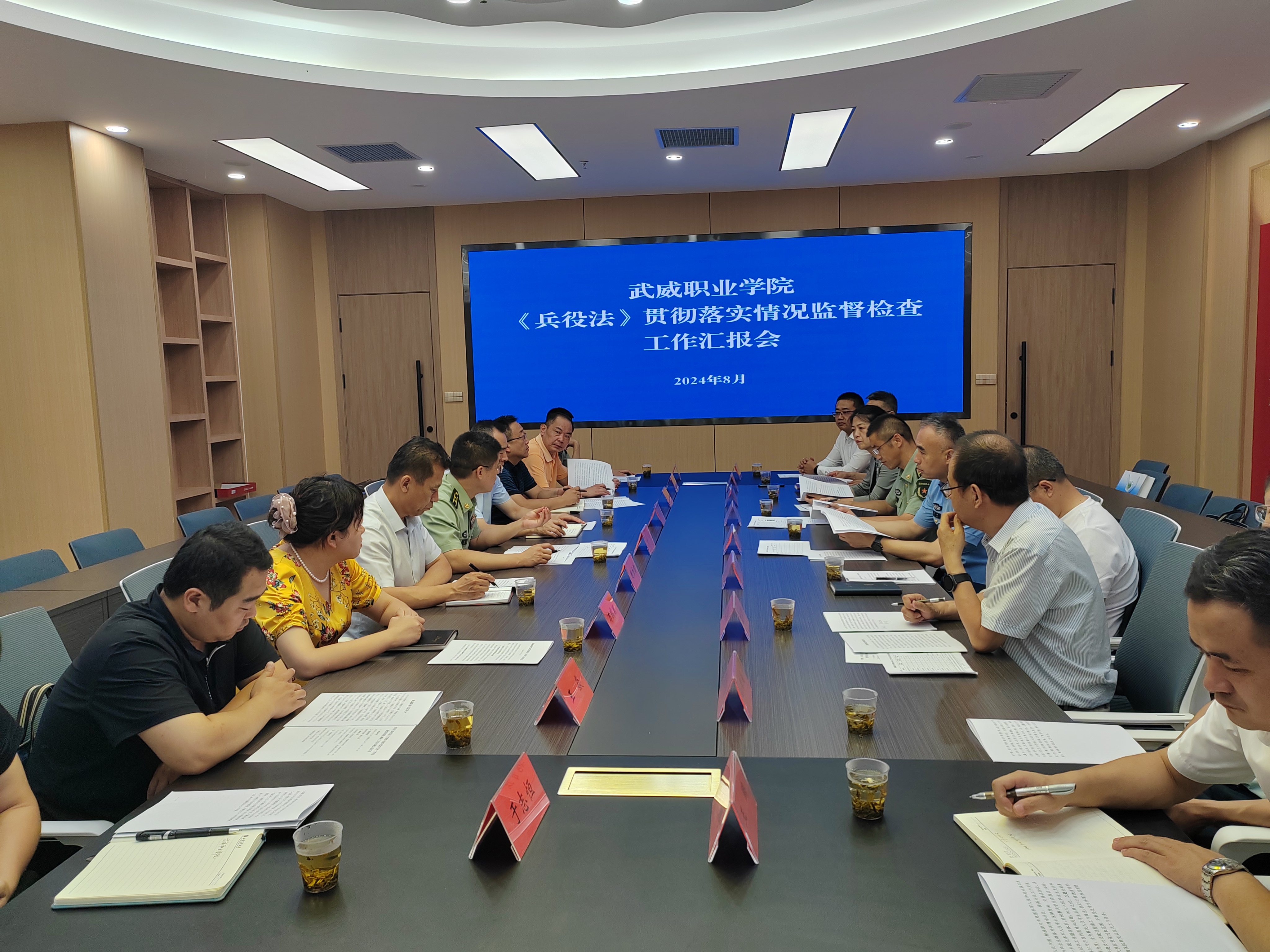 8月2日上午,省級(jí)《兵役法》貫徹落實(shí)情況監(jiān)督檢查工作組一行9人在甘肅省軍區(qū)動(dòng)員局征集處程龍?zhí)庨L(zhǎng)的帶領(lǐng)下,在武威軍分區(qū)大校副司令員吳沖、武威市司法局副局長(zhǎng)黨萬(wàn)馳和武威市教育局副局長(zhǎng)馬曉麗的陪同下,來(lái)我校調(diào)研《兵役法》貫徹落實(shí)情況。學(xué)校黨委書(shū)記王宏,黨委副書(shū)記翟存祥,黨委委員、副校長(zhǎng)王永緒陪同調(diào)研。