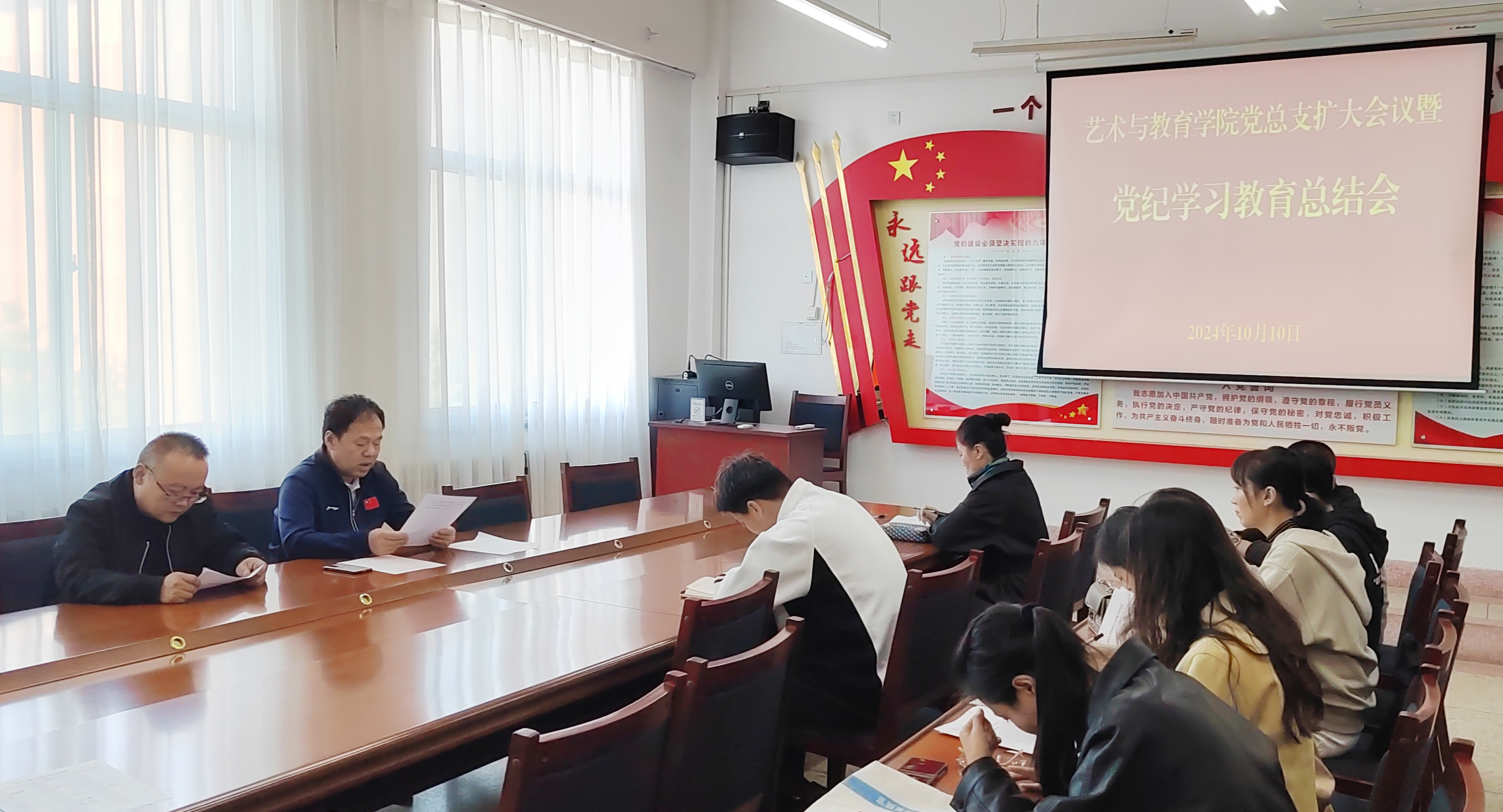 10月10日下午,學(xué)院黨總支擴(kuò)大會議在勵勤樓209會議室舉行,會議學(xué)習(xí)傳達(dá)了習(xí)近平總書記在甘肅考察時的關(guān)于黨紀(jì)學(xué)習(xí)教育的重要講話和指示精神,黨的二十屆三中全會審議通過的《中共中央關(guān)于進(jìn)一步全面深化改革、推進(jìn)中國式現(xiàn)代化的決定》中關(guān)于黨紀(jì)學(xué)習(xí)教育的有關(guān)內(nèi)容和中央、省委、市委、學(xué)校黨委黨紀(jì)學(xué)習(xí)教育總結(jié)大會精神,總結(jié)了藝術(shù)與教育學(xué)院黨總支黨紀(jì)學(xué)習(xí)教育開展情況。會議由黨總支書記王政主持,學(xué)院各黨支部委員參加,全體行政人員列席。