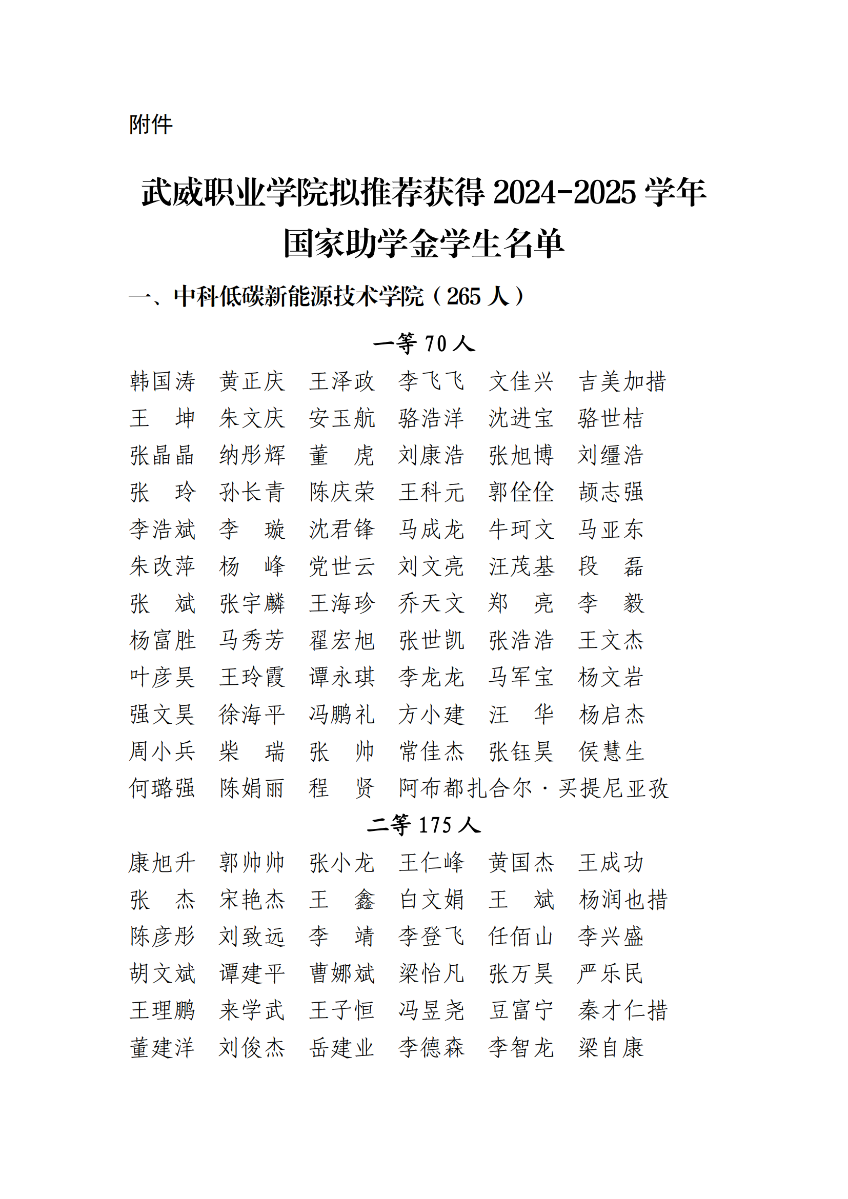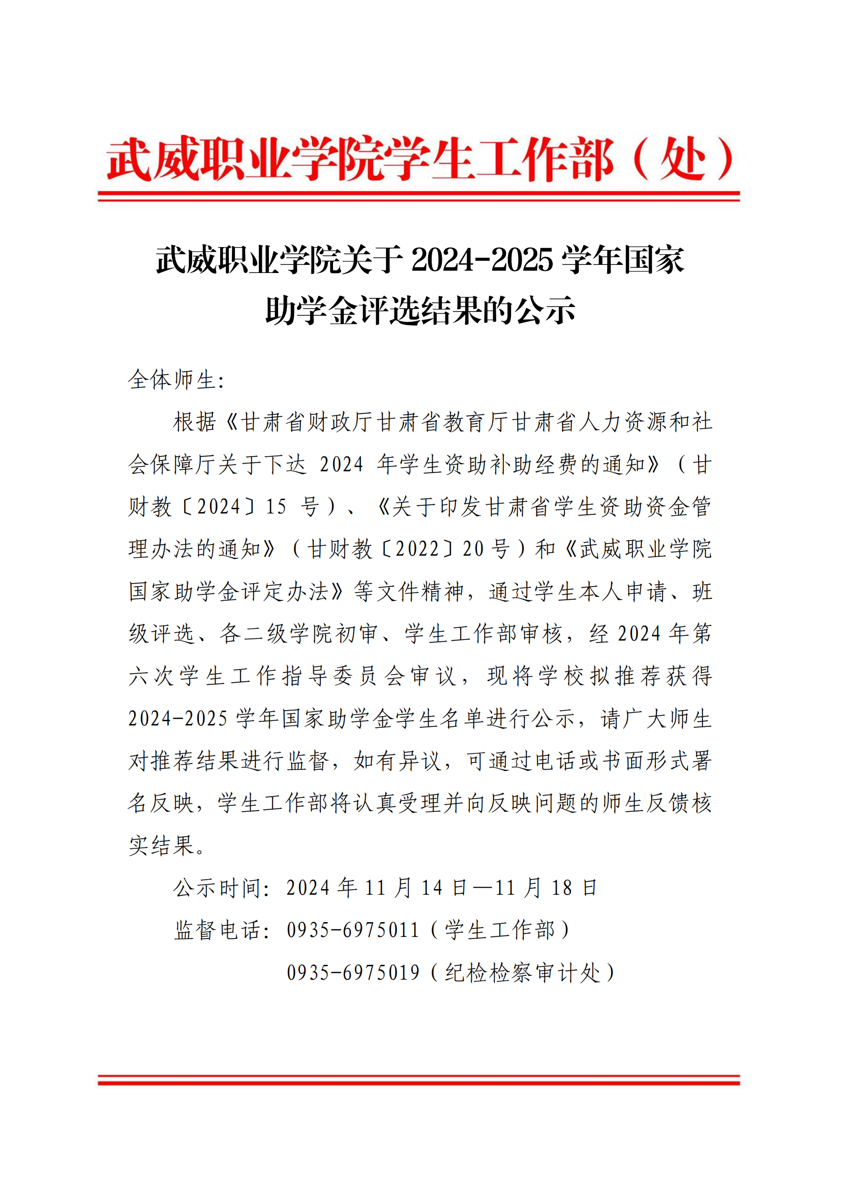 武威職業(yè)學(xué)院關(guān)于2024-2025學(xué)年國(guó)家助學(xué)金評(píng)選結(jié)果的公示