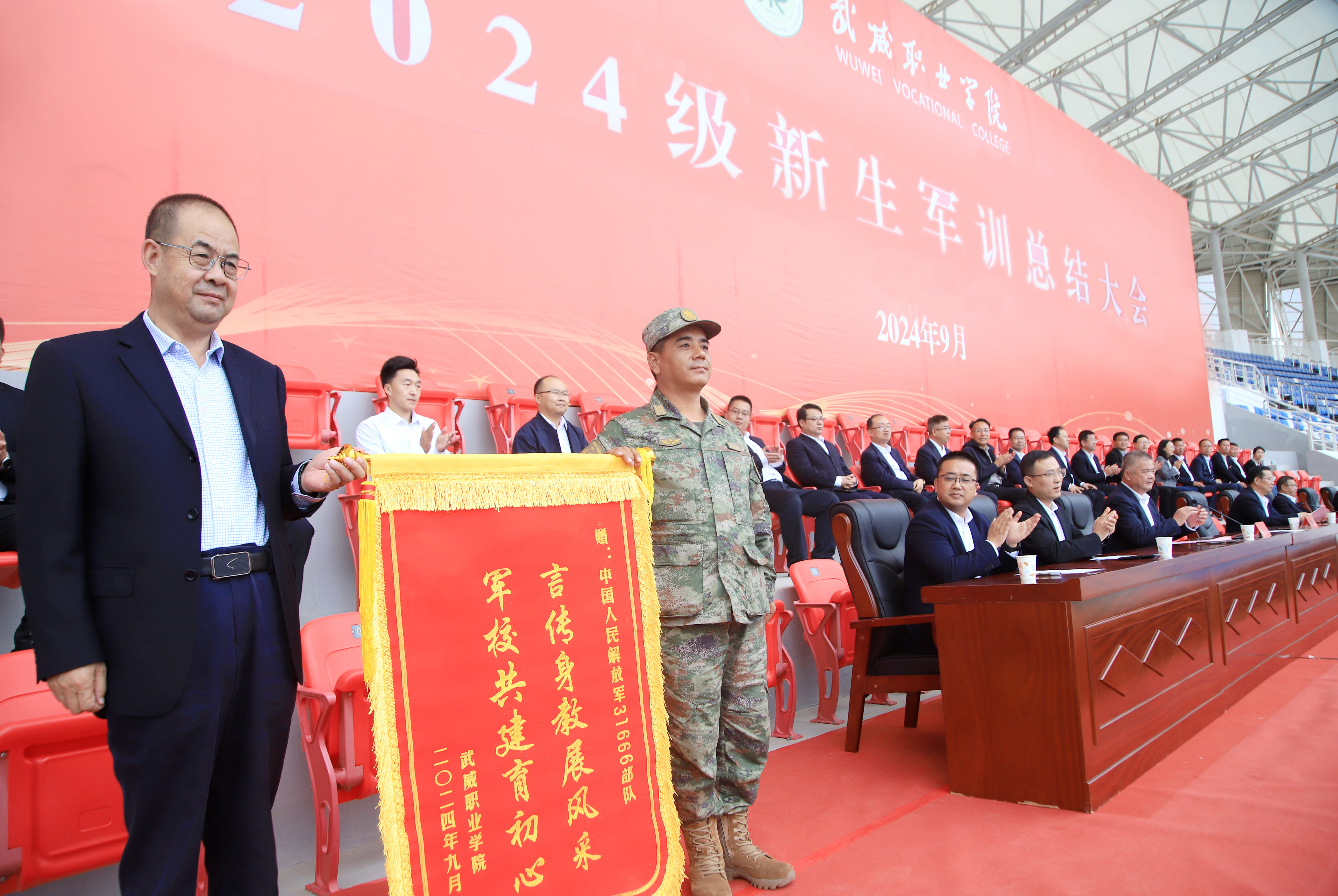 會上,翟存祥代表學(xué)校向承訓(xùn)部隊贈送錦旗致以崇高的敬意,向奮戰(zhàn)在訓(xùn)練一線的軍訓(xùn)教官及工作人員表示衷心的感謝!陳曉煜宣讀了2024級新生軍訓(xùn)工作先進集體、先進個人、優(yōu)秀教官和軍訓(xùn)標兵擬表彰名單。與會領(lǐng)導(dǎo)為軍訓(xùn)先進集體和個人頒發(fā)了獎牌和榮譽證書。