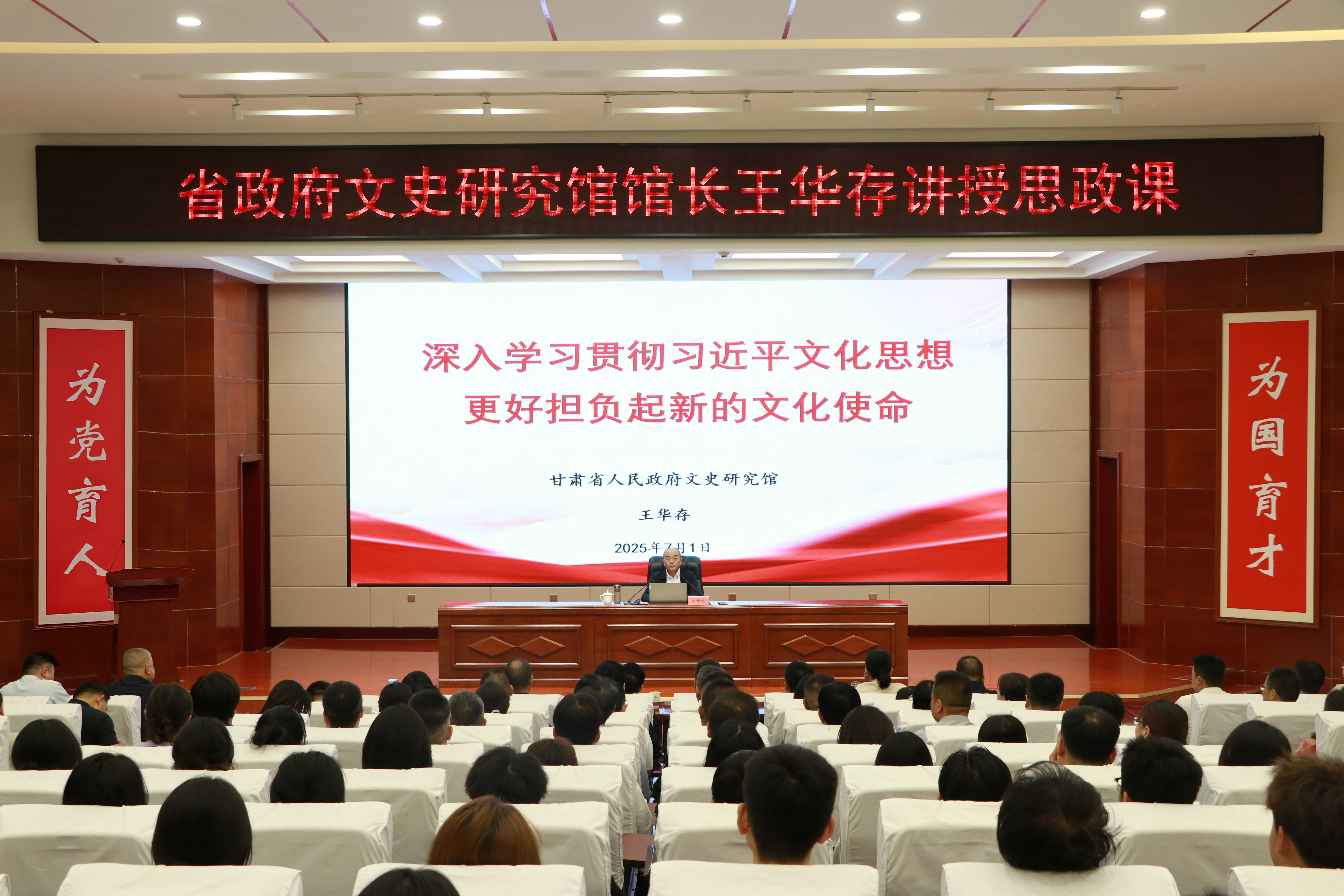 7月1日,在全校上下喜迎中國共產(chǎn)黨成立104周年之際,甘肅省人民政府文史研究館黨組書記、館長王華存到學(xué)校為師生講授思想政治理論課。王華存以“深入學(xué)習(xí)貫徹習(xí)近平文化思想 更好擔(dān)負(fù)起新的文化使命”為題,從深刻認(rèn)識(shí)習(xí)近平文化思想的形成過程、習(xí)近平文化思想的豐富內(nèi)涵和核心要義、甘肅文化歷史簡述、當(dāng)代青年如何更好擔(dān)當(dāng)起新的文化使命四個(gè)方面對(duì)習(xí)近平文化思想進(jìn)行了全面解讀。黨委書記王宏主持,學(xué)校領(lǐng)導(dǎo)、中層管理干部及師生代表共200余人到場聆聽。