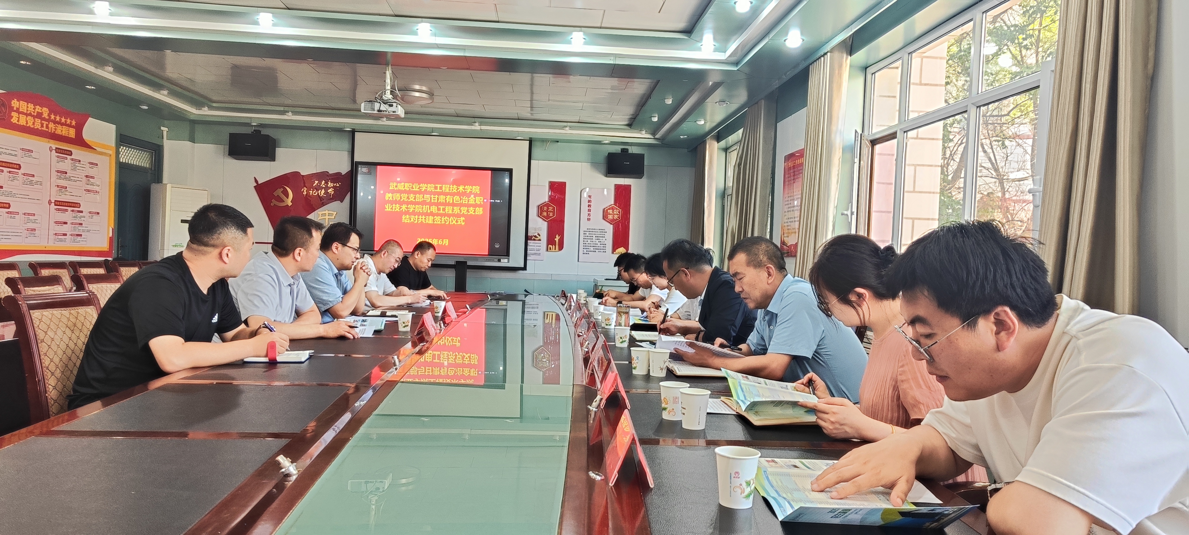 為進(jìn)一步加強(qiáng)黨組織建設(shè),提升黨員的政治素養(yǎng)和黨性修養(yǎng),6月11日,學(xué)校工程技術(shù)學(xué)院教師黨支部和甘肅有色冶金職業(yè)技術(shù)學(xué)院機(jī)電工程系黨支部結(jié)對(duì)共建簽約儀式在博學(xué)樓黨員活動(dòng)室舉行。甘肅有色冶金職業(yè)技術(shù)學(xué)院組織部部長高立兵、督導(dǎo)中心主任趙登峰、機(jī)電工程系黨支部書記侯婷婷,學(xué)校工程技術(shù)學(xué)院黨總支書記王鐸云、副院長徐生龍出席儀式,雙方黨員共計(jì)20人參加儀式。