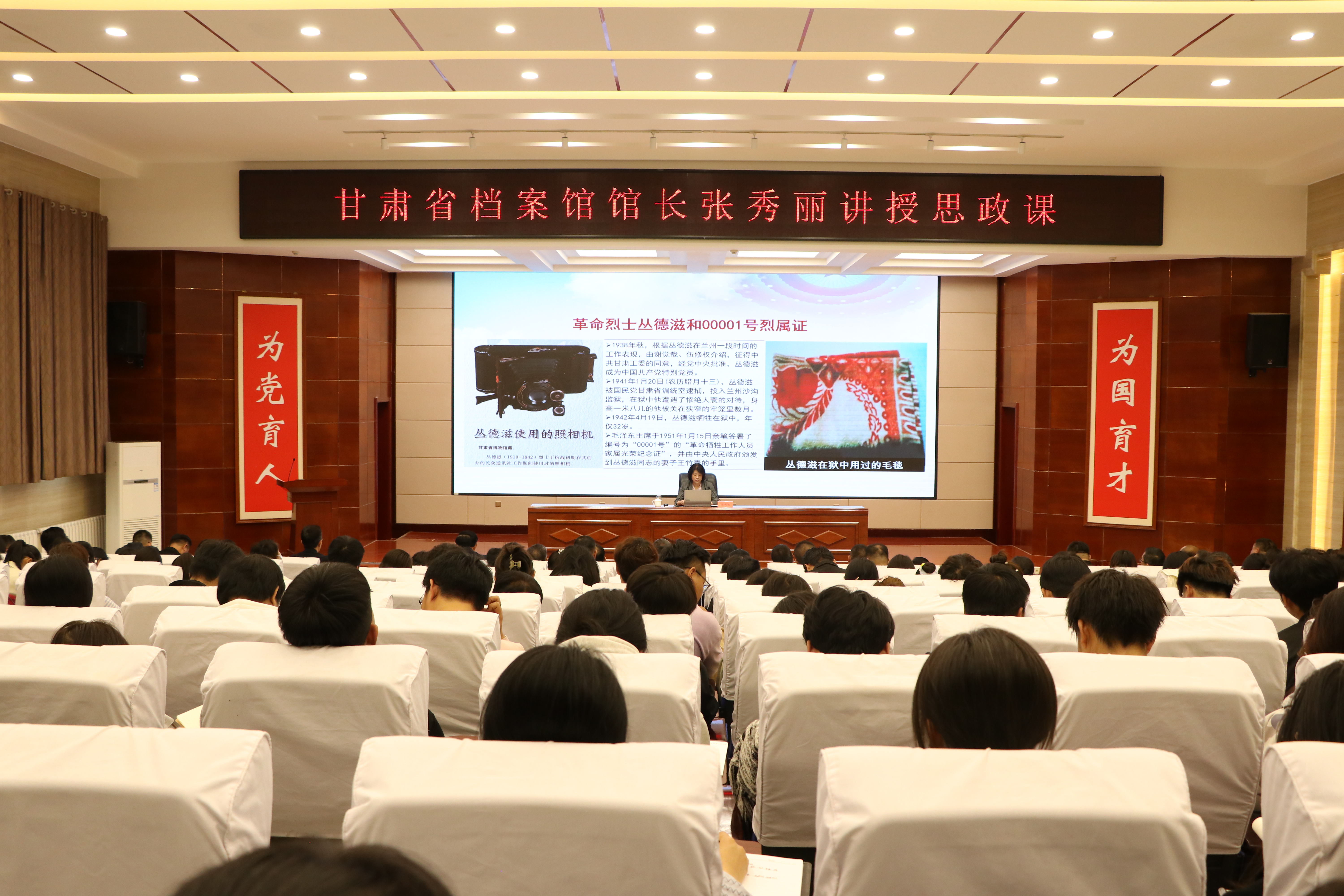 張秀麗結(jié)合自身從事檔案管理和文化研究的豐富經(jīng)驗,從檔案“存史、資政、育人”根本任務出發(fā),通過大量珍貴檔案文獻和歷史案例,系統(tǒng)闡述了檔案在記錄民族苦難輝煌、服務當代治國理政、培育時代新人中的重要作用。報告中,她以館藏漢代簡牘、革命烈士叢德滋00001號烈屬證、民勤治沙檔案、甘肅地震檔案等一批具有歷史代表性和地域特色的檔案為載體,帶領(lǐng)師生穿越時空,感受中華民族生生不息的精神力量,深刻解讀“勿忘昨天的苦難輝煌,無愧今天的使命擔當,不負明天的偉大夢想”的時代內(nèi)涵。