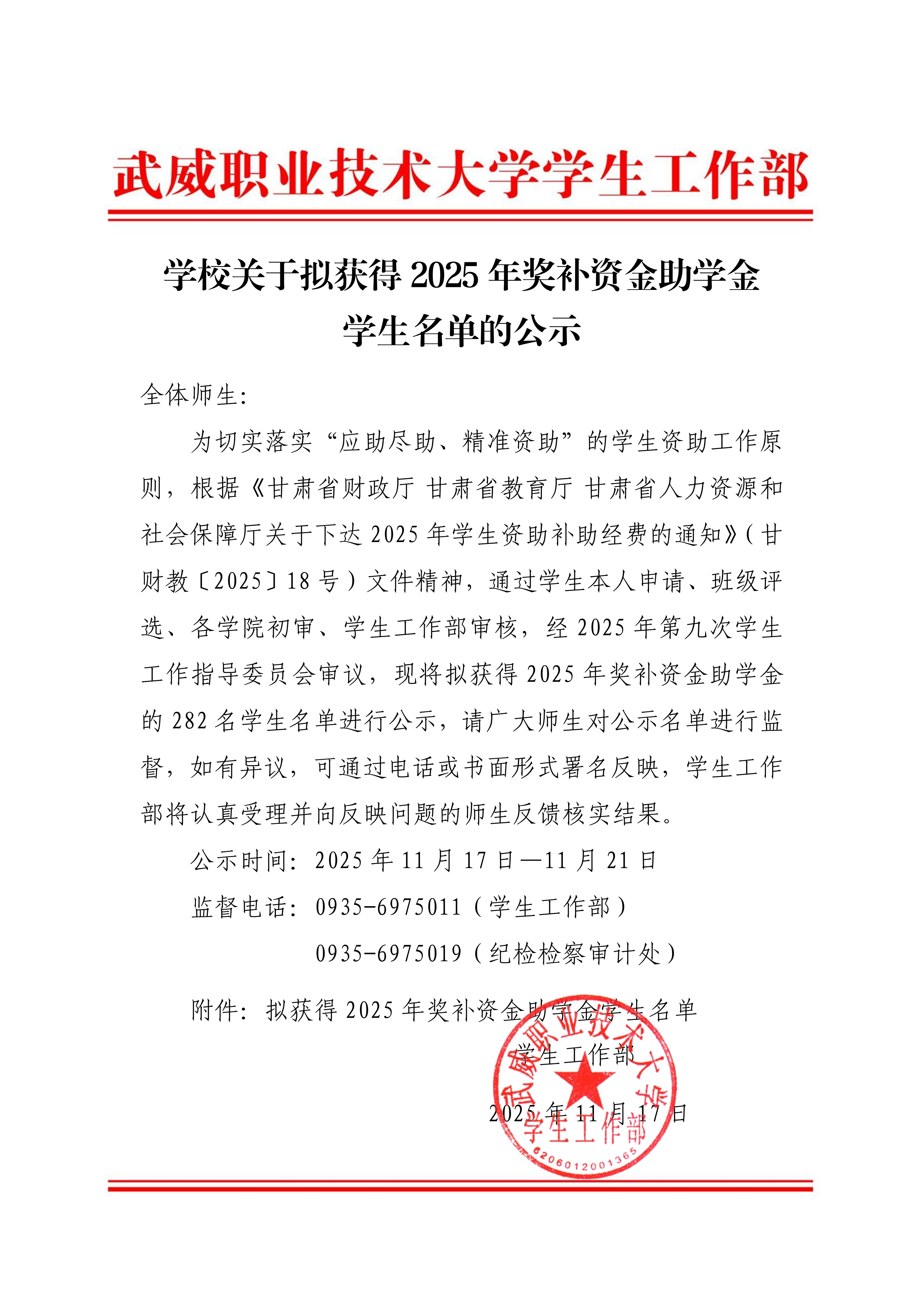 學(xué)校關(guān)于擬獲得2025年獎補資金助學(xué)金學(xué)生名單的公示