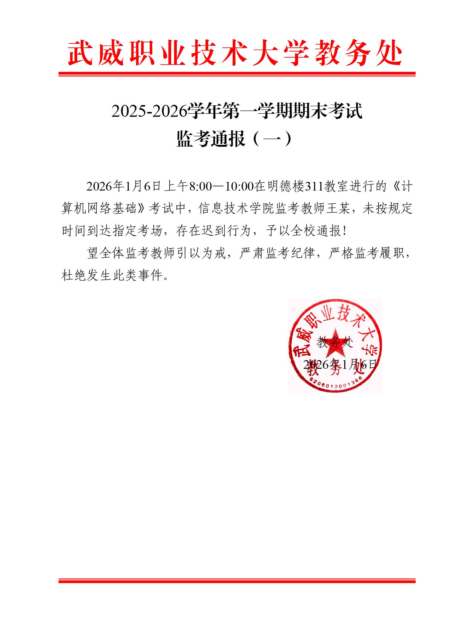 2025-2026學(xué)年第一學(xué)期期末考試監(jiān)考通報(一)