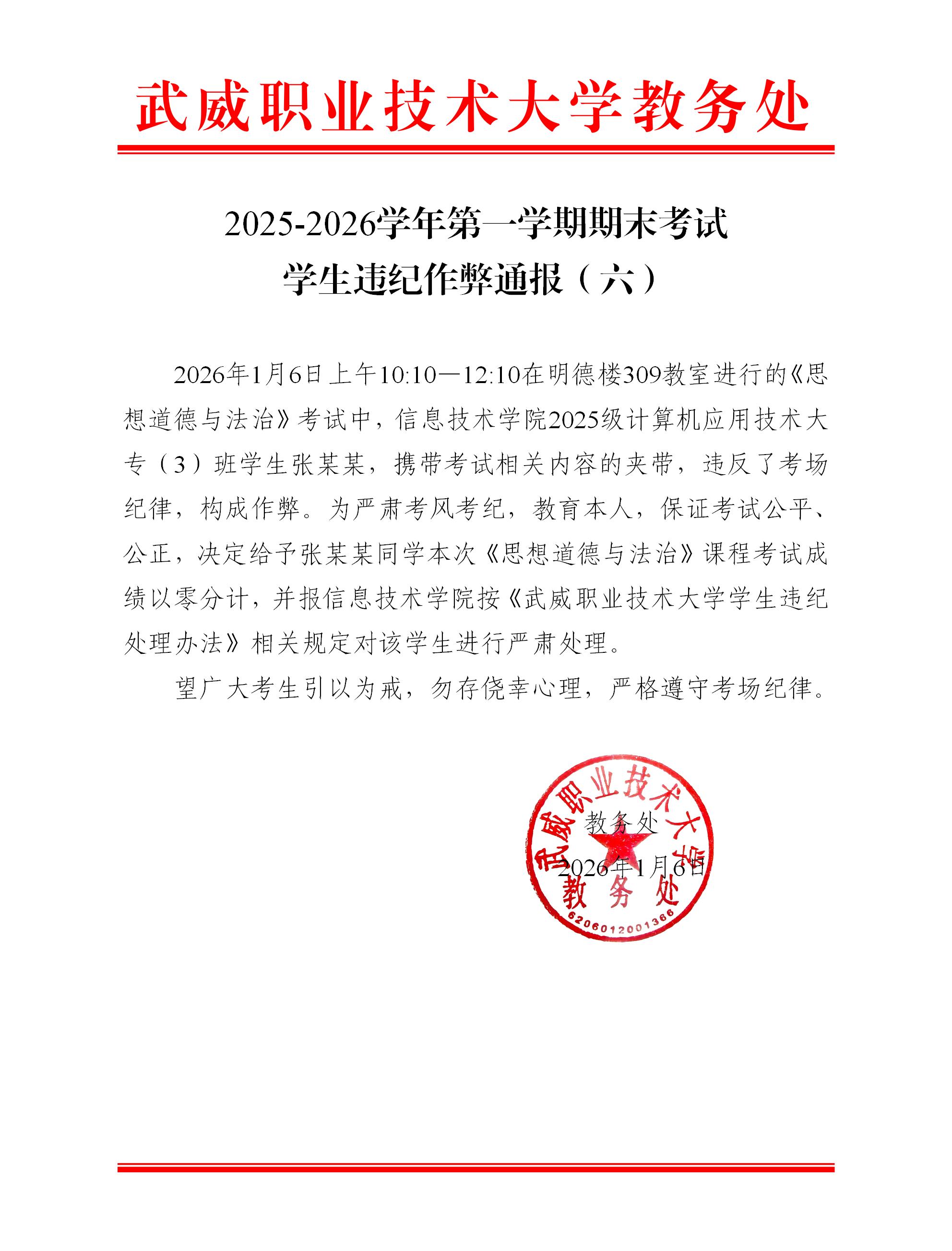 2025-2026學(xué)年第一學(xué)期期末考試學(xué)生違紀(jì)作弊通報(bào)(六)