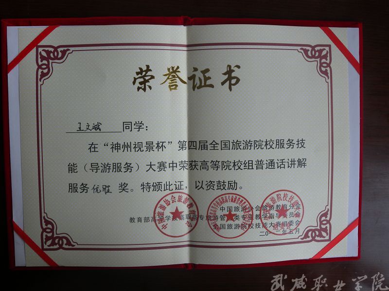 經(jīng)濟(jì)管理系晉藝波老師指導(dǎo)我系旅游管理、酒店管理專業(yè)學(xué)生參加2012年“神州視景杯”第四屆全國旅游院校服務(wù)技能(導(dǎo)游技能)大賽,榮獲優(yōu)秀獎。