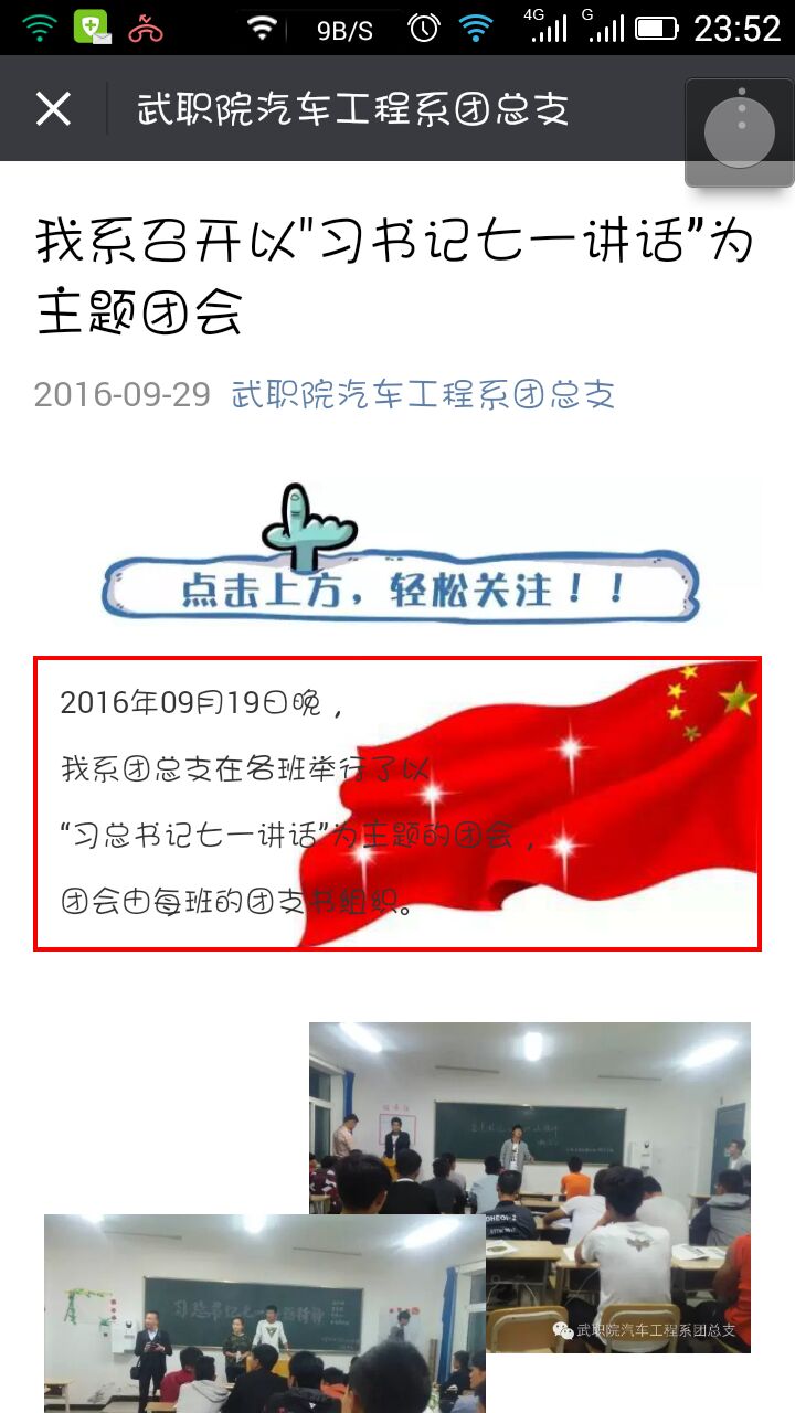 為深入推進(jìn)我系各級團(tuán)組織、團(tuán)干部和團(tuán)員青年學(xué)習(xí)習(xí)近平總書記“七一”重要講話精神,根據(jù)院團(tuán)委統(tǒng)一安排,汽車工程系團(tuán)總支于9月下旬在各班以主題團(tuán)會、座談會、黑板報等形式展開學(xué)習(xí)討論,并在系微信、微博公眾平臺上進(jìn)行了宣傳教育。