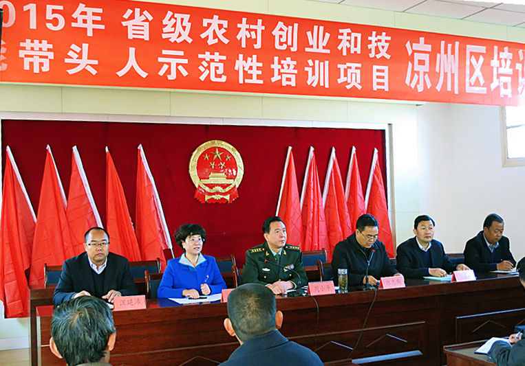 2015年“涼州區(qū)農(nóng)村創(chuàng)業(yè)和技能帶頭人省級(jí)示范培訓(xùn)班”于10月28—29日在涼州區(qū)謝河鎮(zhèn)舉行。28日上午,涼州區(qū)副區(qū)長張志殿主持開班儀式,武威市委常委、武威軍分區(qū)政委周小平做了動(dòng)員講話,學(xué)院副院長潘玉華、區(qū)委組織部副部長、區(qū)人社局局長劉景鵬、副局長沈天舉、謝河鎮(zhèn)黨委書記黨延平、鎮(zhèn)長汪延沛參加了開班儀式。
