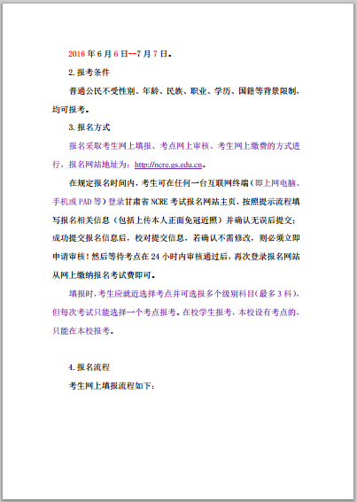 根據(jù)甘肅省教育考試院《關(guān)于做好2016年9月全國計算機等級考試網(wǎng)上報名工作的通知》(甘教考院〔2016〕95號文件)要求,2016年9月全國計算機等級考試(NCRE)將于2016年6月6日開始報名,全省統(tǒng)一實行網(wǎng)上報名。本次報名按照考生網(wǎng)上填報、考點網(wǎng)上審核、考生網(wǎng)上繳費的步驟進(jìn)行?,F(xiàn)將有關(guān)安排及要求通知如下: