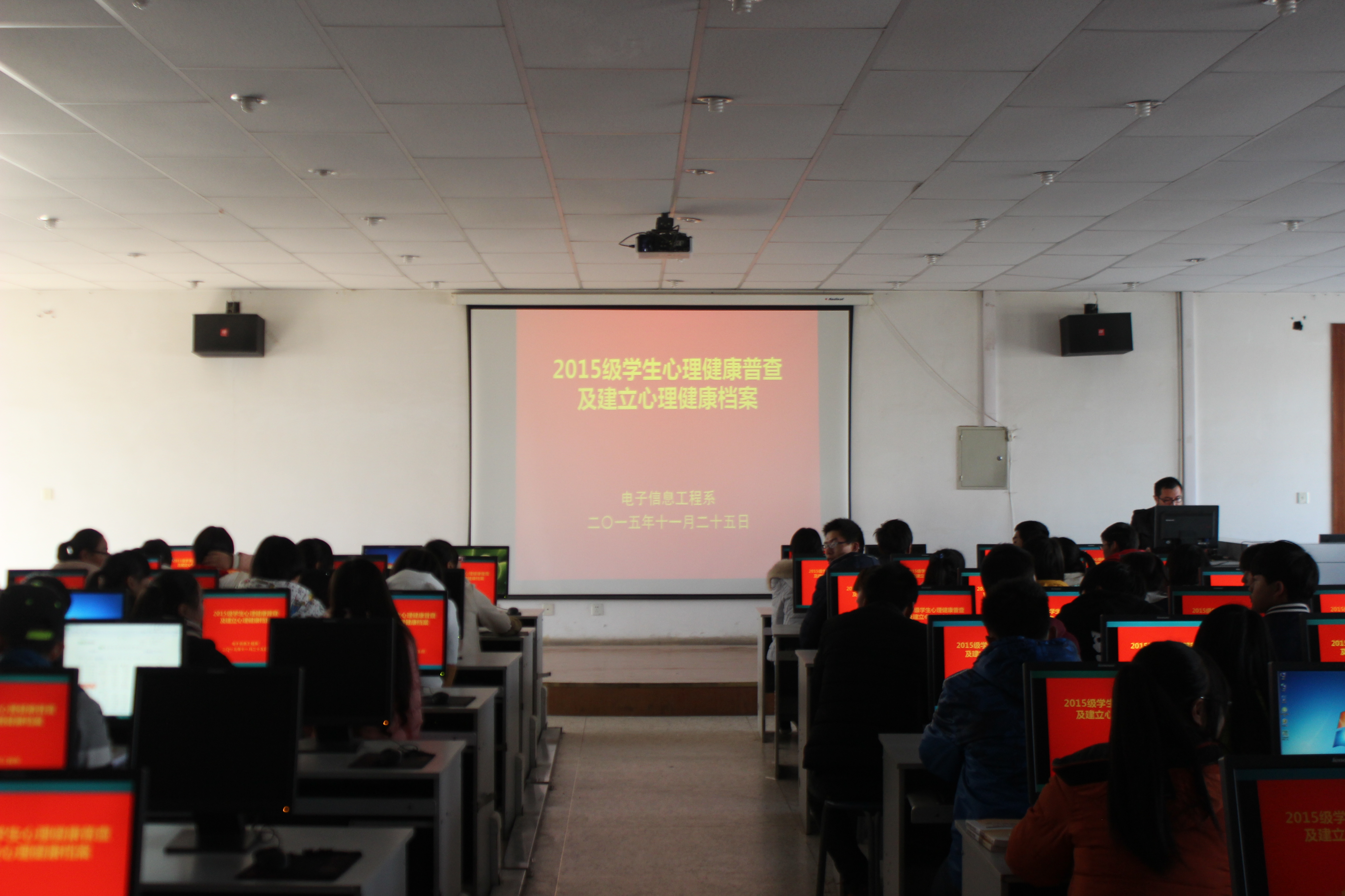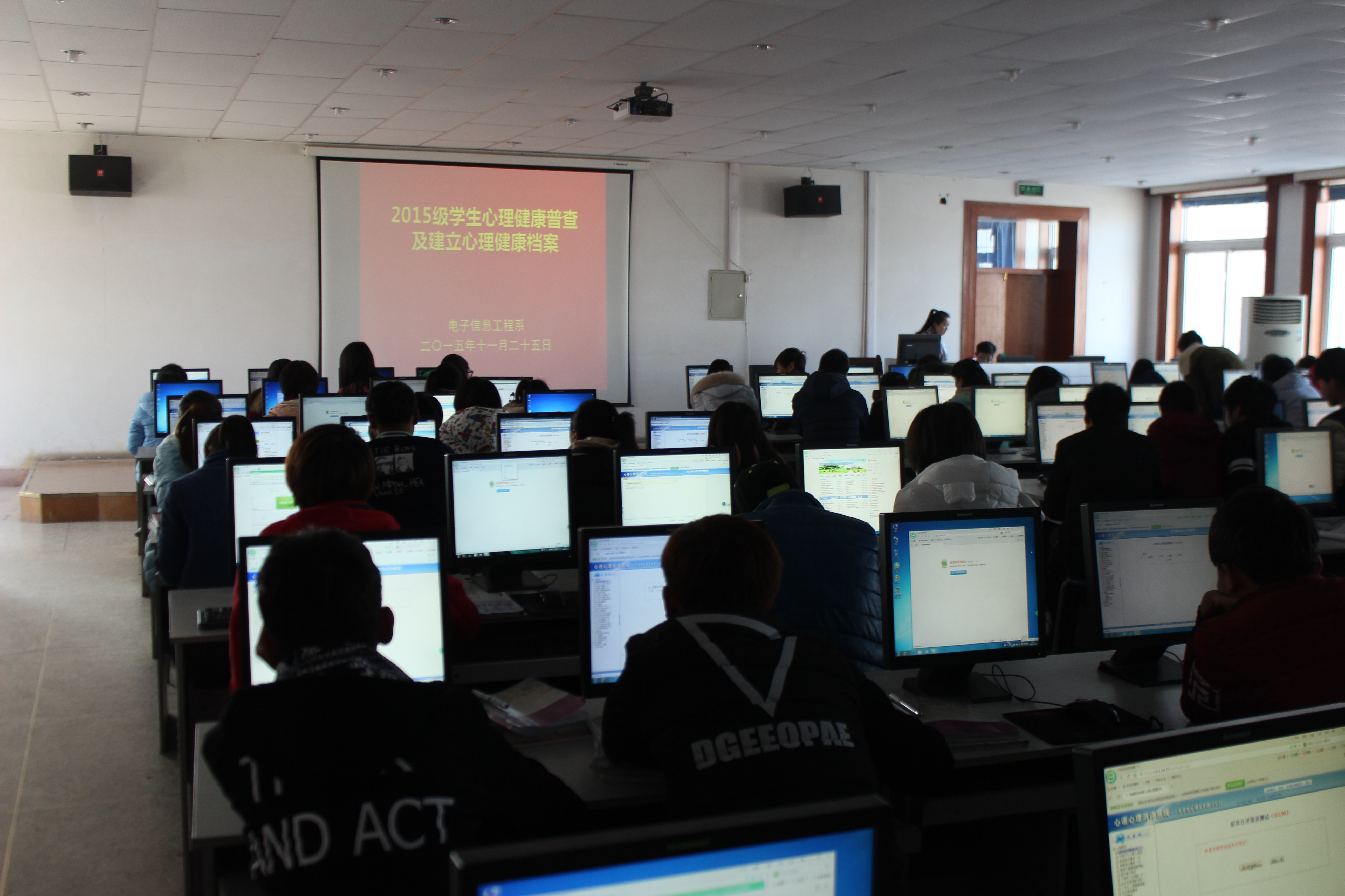 為及時(shí)掌握2015級(jí)學(xué)生的心理健康狀況,有針對性地進(jìn)行心理健康教育,按照學(xué)院心理健康普查安排及要求,11月25日12時(shí)10分,電子信息工程系組織2015級(jí)學(xué)生226人在尚德樓十號(hào)機(jī)房完成了心理健康狀況普測工作,并為每個(gè)同學(xué)建立了心理健康檔案。
