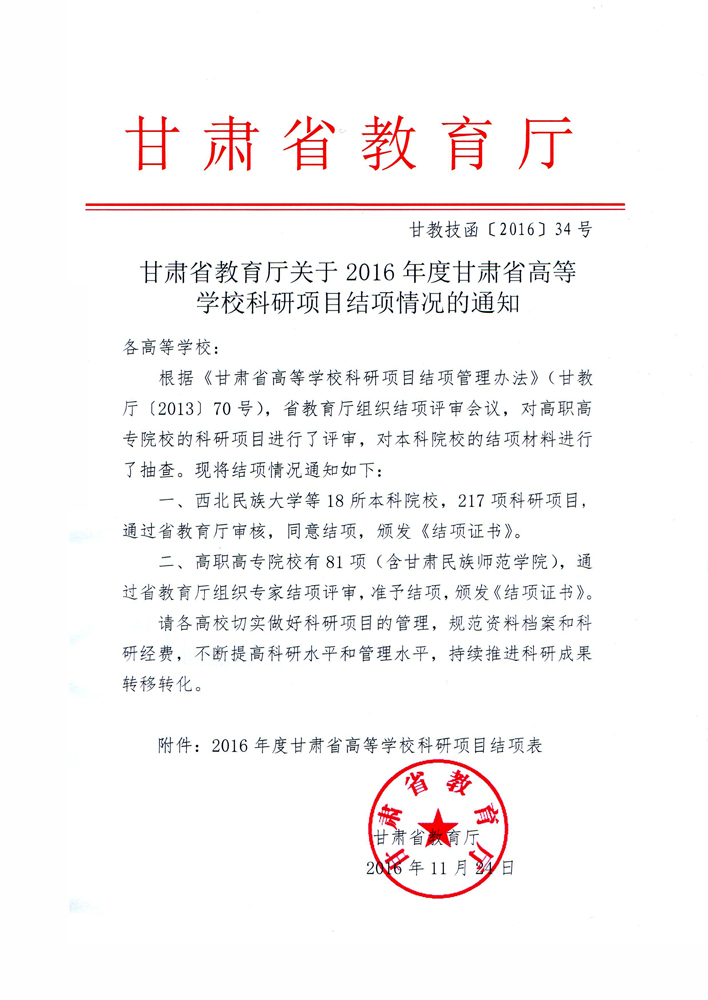 甘肅省教育廳關(guān)于2016年度甘肅省高等學(xué)??蒲许?xiàng)目結(jié)項(xiàng)情況的通知