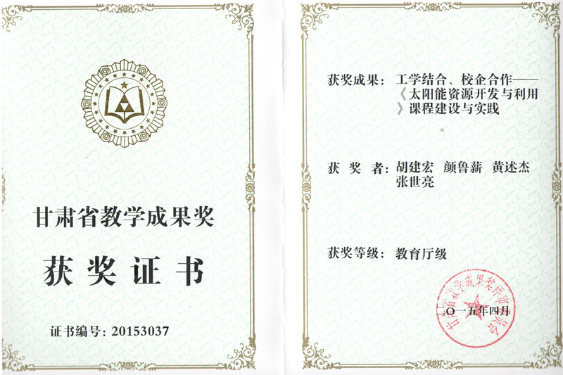 甘肅省教學(xué)成果獎(jiǎng):工學(xué)結(jié)合、校企合作——《太陽(yáng)能資源開發(fā)與利用》課程建設(shè)與實(shí)踐