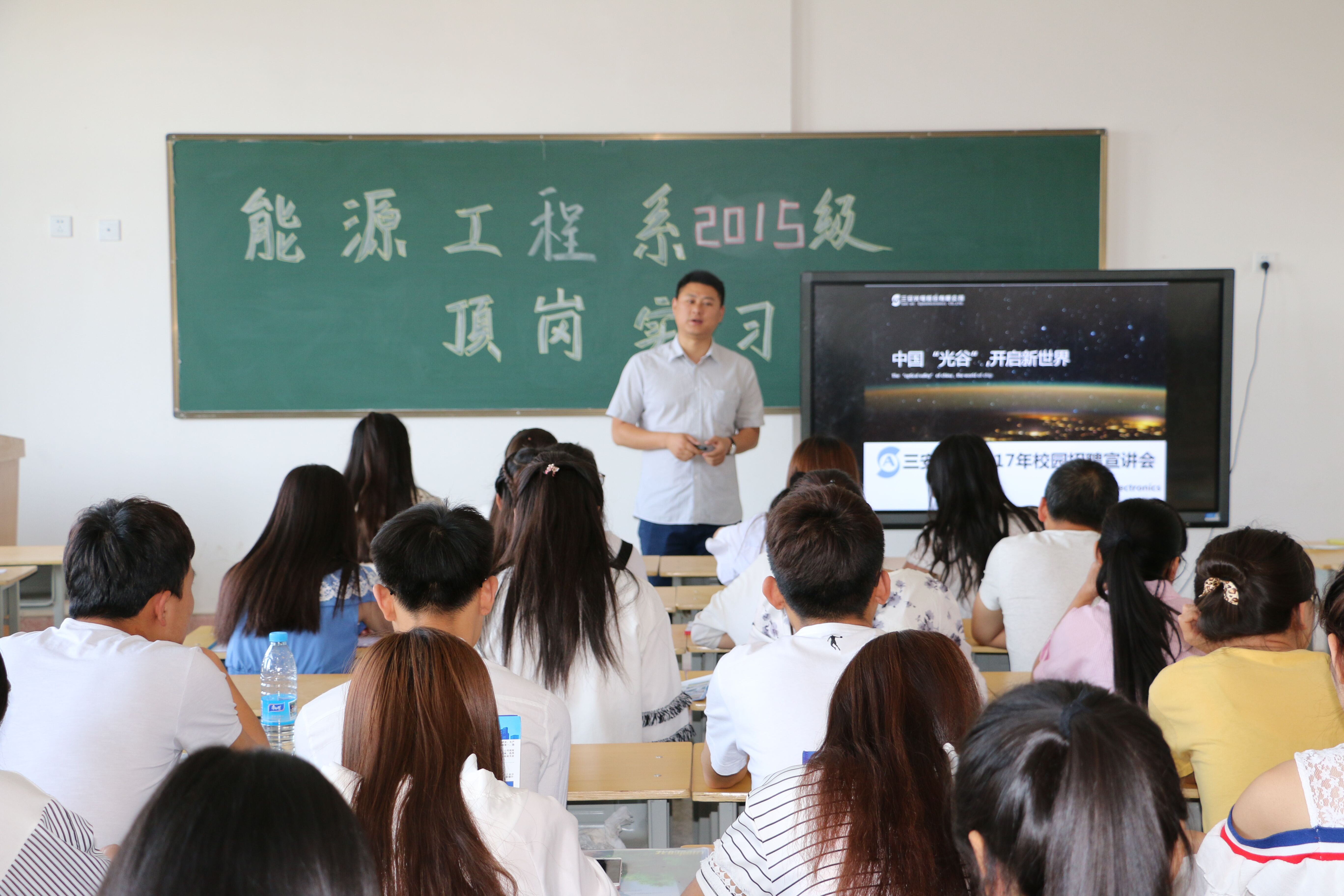 安徽三安光電有限公司在行樹樓504教室開展了頂崗實(shí)習(xí)宣講會,2015級農(nóng)村能源與環(huán)境技術(shù)大專班和2015級太陽能光熱技術(shù)及應(yīng)用大專班學(xué)生參加了此次宣講會。李明經(jīng)理就企業(yè)概況、企業(yè)文化、崗位需求、薪酬待遇等方面向同學(xué)們做了介紹,并對有應(yīng)聘意向的同學(xué)進(jìn)行了面試,最終共有50人被安徽三安光電有限公司錄用。
