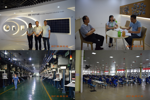 晶科能源控股有限公司是全球為數(shù)不多的擁有垂直一體化產(chǎn)業(yè)鏈的光伏制造企業(yè),業(yè)務(wù)涵蓋了優(yōu)質(zhì)的硅錠、硅片、電池片生產(chǎn)、高效單多晶光伏組件制造以及光伏電站建設(shè)等領(lǐng)域,是目前全球光伏組件生產(chǎn)的龍頭企業(yè),2016年中國500強企業(yè)。公司負責(zé)人帶領(lǐng)考察人員參觀了公司現(xiàn)代化的生產(chǎn)車間、晶科商學(xué)院、員工宿舍和食堂,介紹了公司的發(fā)展情況和用人需求。在考察過程中,考察人員就公司給學(xué)生提供的工作崗位、待遇、住宿、安全管理等情況與企業(yè)負責(zé)人進行了深入交流。