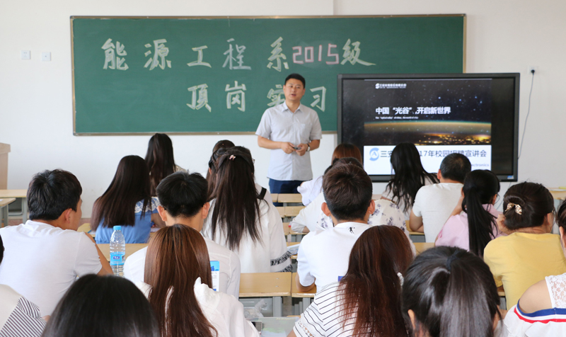 安徽三安光電有限公司在行樹樓504教室開展了頂崗實習(xí)宣講會,2015級農(nóng)村能源與環(huán)境技術(shù)大專班和2015級太陽能光熱技術(shù)及應(yīng)用大專班學(xué)生參加了此次宣講會。李明經(jīng)理就企業(yè)概況、企業(yè)文化、崗位需求、薪酬待遇等方面向同學(xué)們做了介紹,并對有應(yīng)聘意向的同學(xué)進行了面試,最終共有50人被安徽三安光電有限公司錄用。