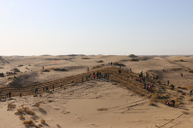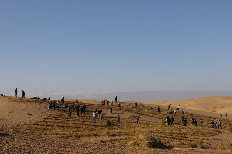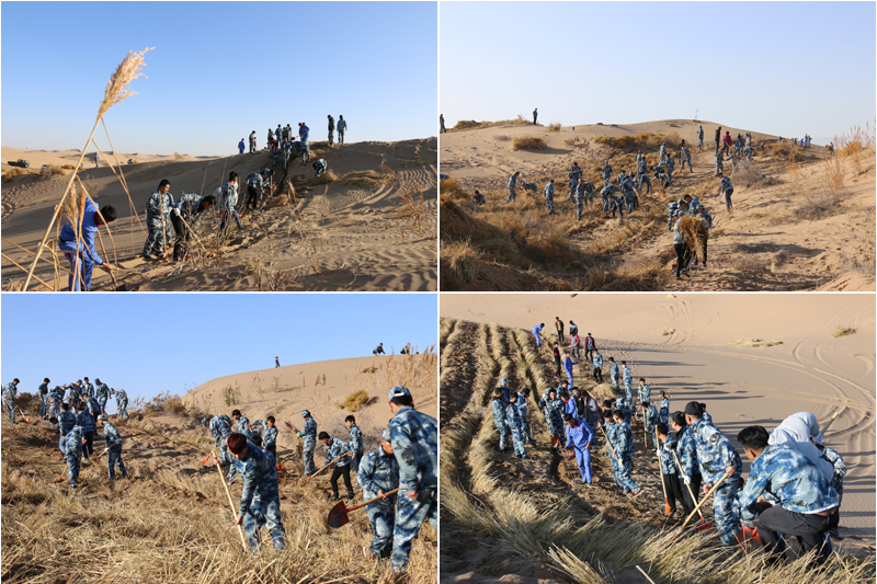在勞動現(xiàn)場,學院領導和師生們不畏冬寒,分工協(xié)作,按照標準和要求劃線開溝、蒲草培沙、等距離推進,現(xiàn)場一片熱火朝天的景象?;氖彽纳车厣砼乱?,整齊的稻草方格逐漸向遠處的沙丘覆蓋。